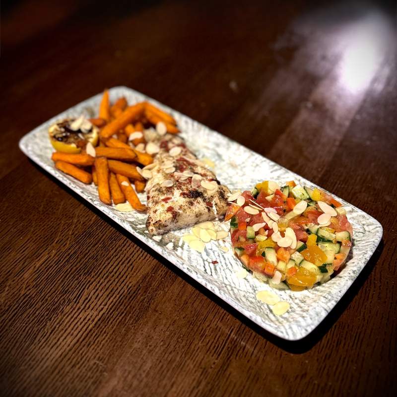 Свиная корейка маринованная в коньяке и приготовленная на гриле с картофельными дольками, стручковой фасолью и болгарским перцем.