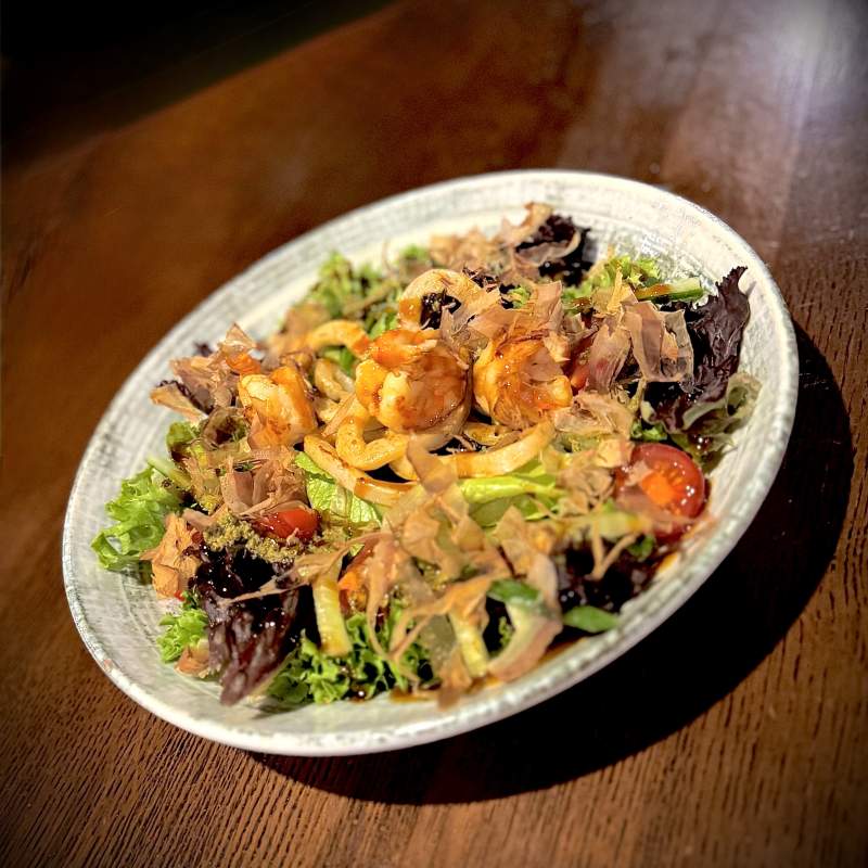 Сочный салат со свежими овощами, красным луком и маслинами. Заправляется соусом на основе оливкового масла. Подается с цельным куском греческого сыра Фета.